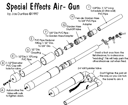 The principal of operation is simple. Air pressure is stored in one part of the gun (Parts A to F), and kept inside the gun with a valve (G) (either manually operated or electric). When the valve is opened the air rushes into the “Barrel” (H-I) of the air-gun and forces out anything that is inside the barrel - confetti or streamers in our case, but it will work with other things like water or talcum powder. (Flour can ignite when it is in a cloud)